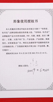 “牡丹花”“怡飾家”品牌是公司主營(yíng)的注冊(cè)商標(biāo),并與明星句號(hào)達(dá)成合作。14年的板材專(zhuān)業(yè)精神和持續(xù)穩(wěn)健的行業(yè)資源優(yōu)化整合。